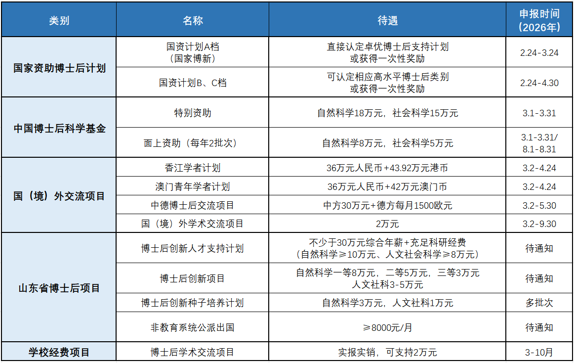 (二)支持申报国家及山东省各类博士后基金项目